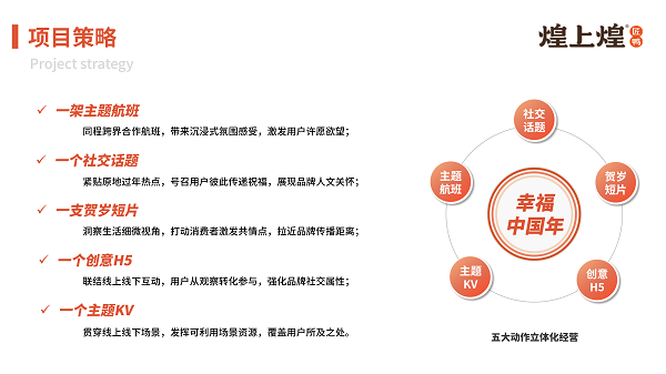 疫情重启后迎来的2021新年,人们对于幸福有更超以往的期待,更需要勇气和鼓励。在竞争激烈的春节营销中,常见的传播内容轰炸已经让消费者形成了高接收阈值,煌上煌另辟蹊径的从吉利话的内容角度出发,以此撕开已经形成高阈值的市场关注。