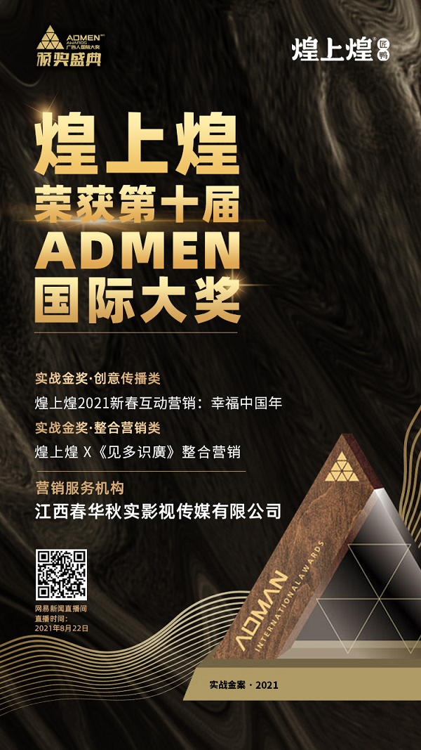 在本届ADMEN国际大奖的激烈角逐中,煌上煌与春华秋实影视传媒联合选送的案例——“煌上煌2021新春互动营销:幸福中国年”、“煌上煌X 《见多识廣》整合营销”在众多品牌案例中脱颖而出,双双荣获ADMEN国际大奖实战金案-创意传播类与整合营销类。两项案例能够在众多行业参选案例中脱颖而出,究竟有何出彩之处?