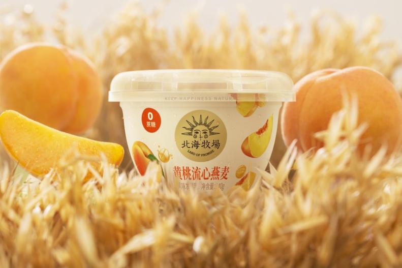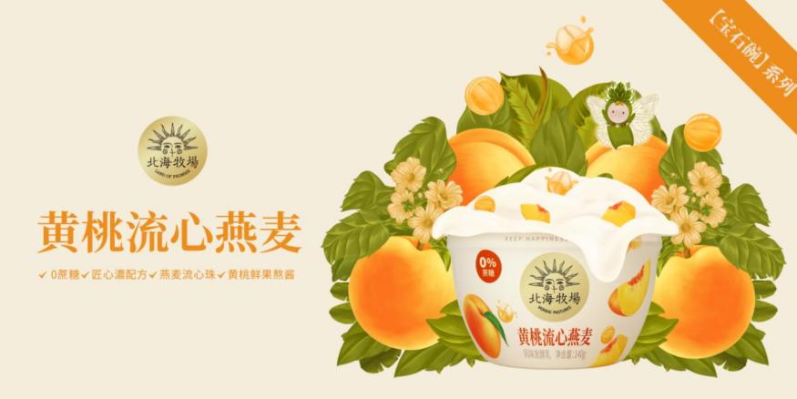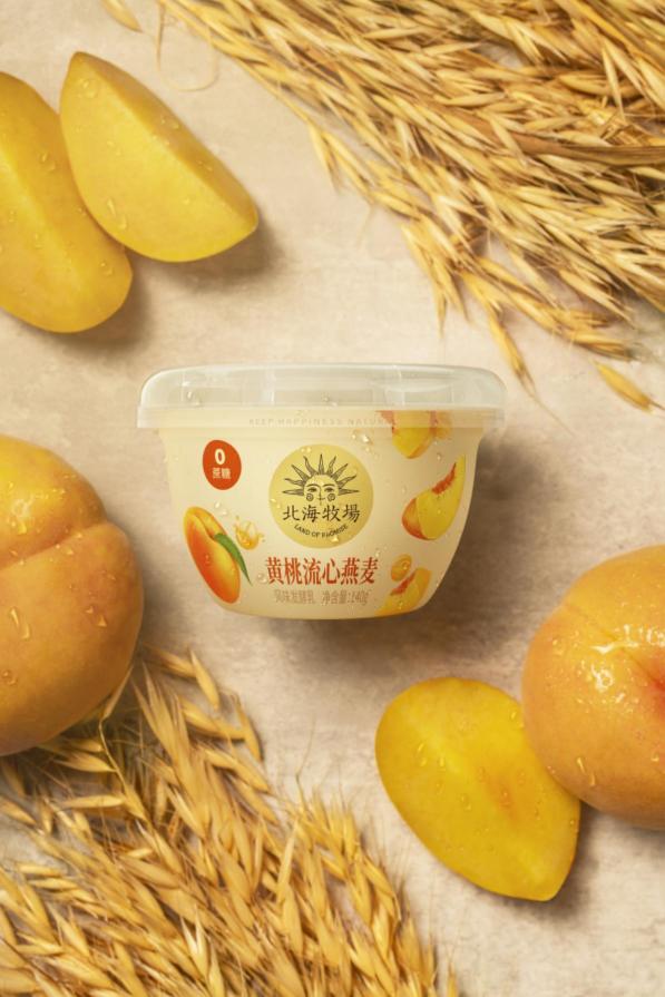 黄桃作为很早就在酸奶中使用的水果,在消费者中认知度很高。为了与市面常见的黄桃口味酸奶有所不同,北海牧场以做法式甜品的思路创新研发,圆润饱满的燕麦流心珠搭配新鲜原切的黄桃果肉,浓郁的麦香包裹于新鲜多汁的黄桃中,糯糯燕麦粒的流心珠在唇齿间绽放。奶香、麦香和黄桃果香的三重口感,不仅健康,还很美味。黄桃流心燕麦的推出,丰富了北海牧场宝石碗系列的产品矩阵,以独具匠心的理念与创新,北海牧场成功地在高端市场“卷”出圈。