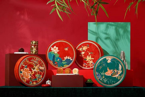 借鉴故宫藏品而设计出的中秋月饼礼盒,吸收了中国优秀传统文化与艺术的养料,让美食成为有着千古底蕴的艺术之作。八角盒系列的盒型设计灵感来源于故宫藏品金嵌宝石镂空花卉纹八角盒,盒面设计灵感来源于故宫多处建筑内藻井结构,独特的设计既让月饼包装推陈出新,又让更多人发现藻井之美;锦盒系列则采用先进印刷技术呈现复古色彩,布面与金属浮雕相映生辉,磅礴秀丽;圆盒系列采用精致刺绣工艺,口沿边合金镶嵌,金碧华丽。