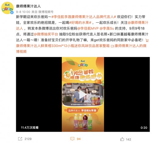 另一方面,代言人育儿理念和康师傅果汁达人所倡导的“欢乐成长”的产品内涵不谋而合。从他们个人的社交平台上分享的日常动态可以看到,代言人始终坚持陪伴孩子一起欢乐成长。