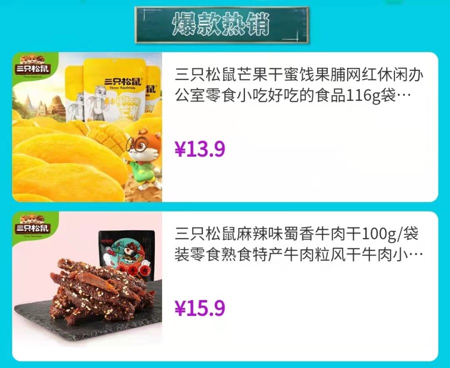 小朋友在宅家看动画片或者过家家时,都少不了休闲零食的陪伴。而“三只松鼠”作为国内第一家定位于纯互联网食品品牌的企业,通过经营坚果、肉脯、果干、膨化等休闲食品,牢牢抓住了当下年轻人的喜好,成为大家眼中的网红零食品牌,也很受小孩子喜爱。眼下,“真快乐”三只松鼠开学日带来了两款爆品,三只松鼠芒果干与三只松鼠麻辣味蜀香牛肉干,这两款都是人气超高的休闲零食,而且是健康的味道,带给你味蕾的极致享受。