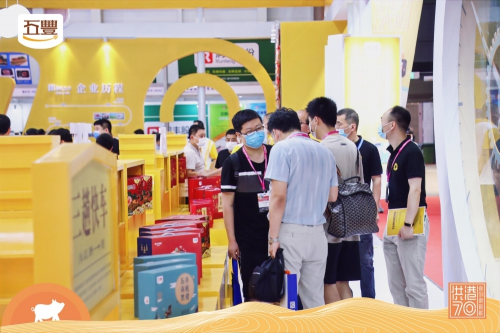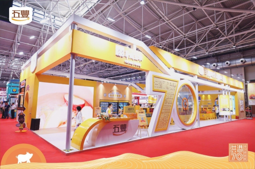 在中国国际肉类工业展览会的N5号馆, 华润五丰掀起了一场橙色风暴。此次展位的设计延续橙色主色调,同时在空间装置上大力创新,充分表现了华润五丰的“供港70年,食刻更新鲜”主题。