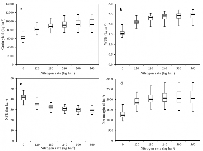 华北平原冬小麦生产中氮肥的不合理施用不仅降低了氮肥的利用效率,而且增加了面源污染的风险。该研究利用两年的实测数据对DSSAT-CERES-Wheat模型进行校正和验证,再加入近40年的历史气象数据,分析不同气象情景下施氮量对滴灌冬小麦产量、水分利用效率、氮肥利用效率和净收益的影响。通过综合分析,研究得出华北平原滴灌冬小麦的施氮量为180 kg/公顷。相比田间试验,该研究充分考虑不同气象情景,可以更科学地为滴灌冬小麦氮素管理提供理论依据,也为氮肥优化管理提供了新的研究方法。