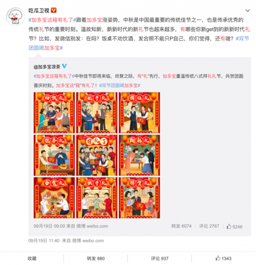 在中秋节前,加多宝凉茶官方微博发布了拜礼八式海报,用创意内容诠释八大有礼场景:家庭宴请、拜见长辈、有客到访、初次见面、感恩师长、夫妻合卺、亲友相见以及庆贺新生。在每一个团聚喜庆的时刻,加多宝带给大家的不仅仅是寓意美满的礼盒,更有着优质的礼仪文化资产的传承。