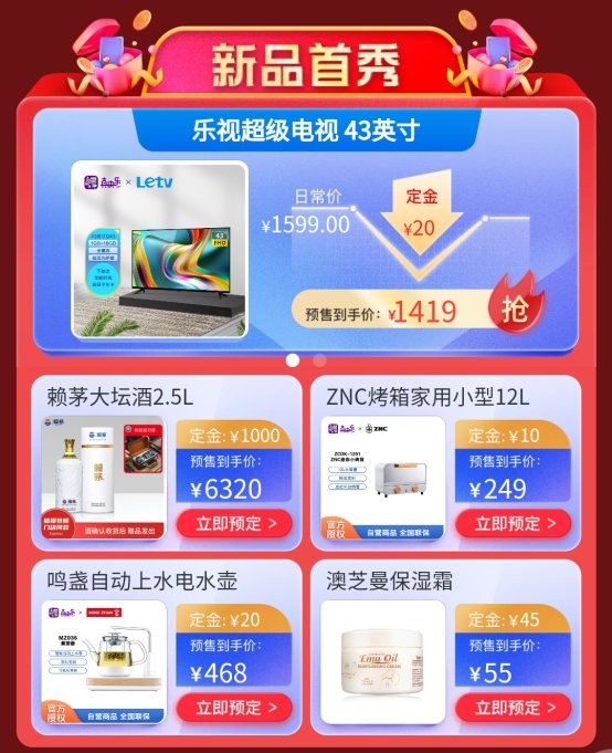 新品首秀专区,日常价399元的贝晨空气炸锅,付定金20元即可259元拿到手;日常价1599元的乐视超级电视预付定金20元,到手价仅需1419元;活动价568元的鸣盏自动上水电水壶付定金20元,预售到手价仅需468元。想象一下,这个国庆节,闻着烤箱里喷香的烤鸡翅,看着乐视电视上精彩纷呈的综艺,再用着鸣盏自动上水电水壶泡一杯清茶,这日子,宅家里也是幸福感满满!