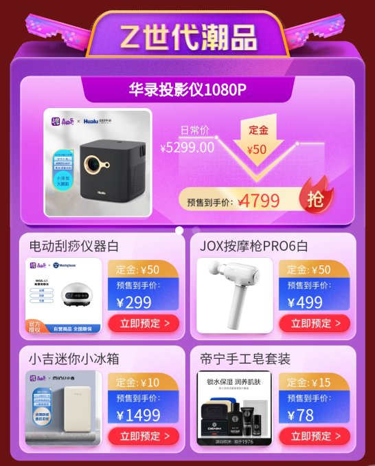 Z世代潮品专区里,小编推荐购买华录方糖A2投影仪。它支持解码4K视频图像信号,拥有2G+16G存储,也可无线畅播视频,使用超舒服。现在参与“真快乐”国庆十一预售活动,活动价5299元,预售到手价仅需4799元,直降500元。小体积,大画面,助你长假舒煲剧!
