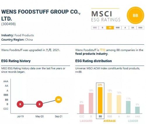 近日,国际权威指数公司MSCI(Morgan Stanley Capital International,摩根士丹利资本国际公司)公布了温氏股份(300498.SZ)的ESG(Environmental,Social and Governance,即环境、社会和公司治理)评级结果。基于公司在环境、社会和公司治理等方面的优异表现,MSCI将温氏股份ESG评级由B级上调至BB级,成为国内“农、林、牧、渔”之“畜牧业”(证监会行业分类)中首家达到BB级评级的上市公司,这是公司自2019年首次被纳入MSCI评级后的一次跃升,体现了全球资本市场对公司稳健经营、风险管理、ESG实践管理水平和长期投资价值的充分肯定和高度认可。