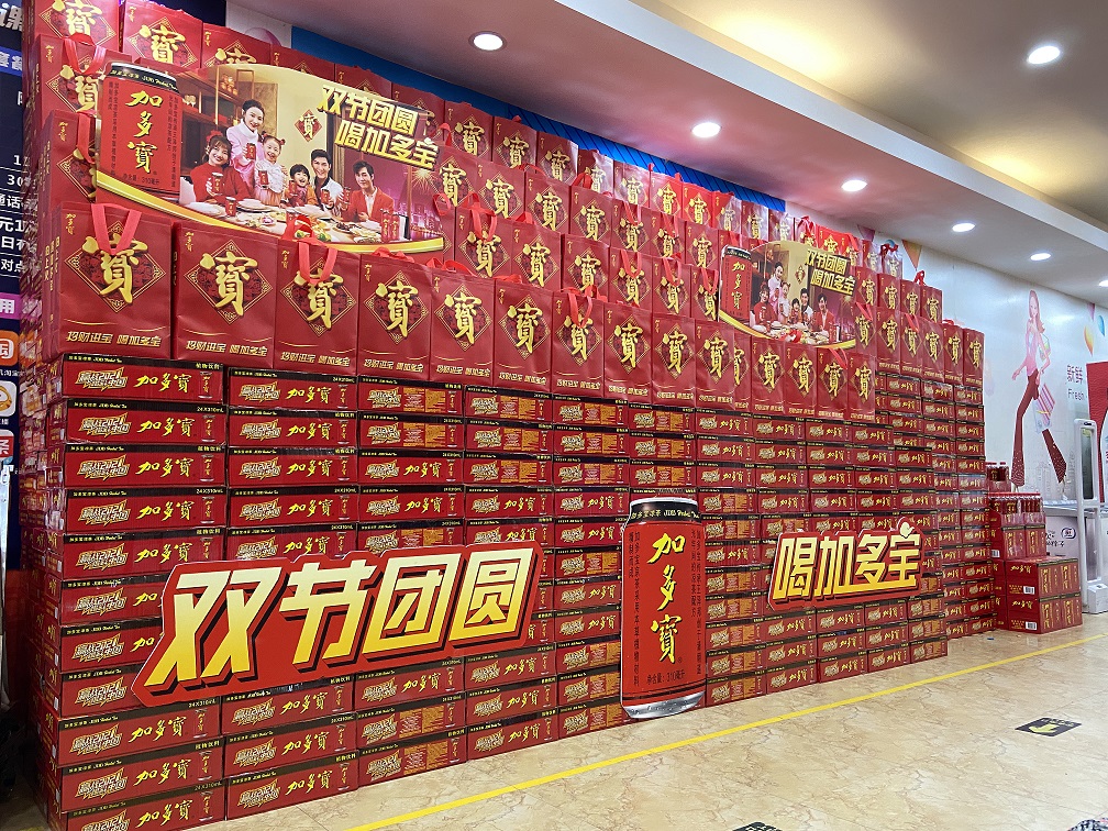 双节期间,加多宝在全国多地商超均以“节礼”身份和喜庆包装堆头,打造欢庆场景,同时还以“双节团圆 喝加多宝”为主题,进行花式互动促销,营造浓浓过节氛围。