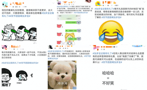 从海报、互动话题到视频广告,这一系列的内容沟通下来,加多宝不仅赢得了出圈声量,其产品本身就不再只是一罐罐健康饮料,而是真实将包装上的“加多一宝”落地到了各种团聚、赠礼场景里,被赋予了情感卖点和祝福意味。每一次基于节日场景的沟通,也在潜移默化地启发着“佳节就送加多宝”的心智。