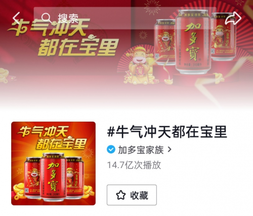 今年春节,加多宝就曾在抖音上发起了#牛气冲天都在宝里的挑战赛,邀请抖音用户们使用加多宝牛年创意贴纸,一起开发新年创作。就这一个挑战就赢得了14.7亿曝光和近30万年轻用户共创,让加多宝互动成为拜年新流行,也实现品牌内容与用户相互赋能的良性闭环。