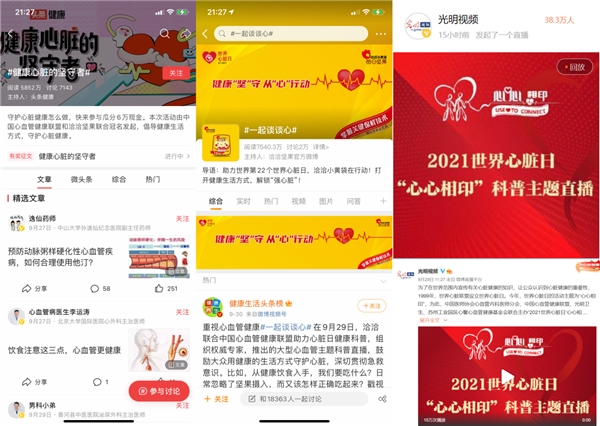 此举也收割大众的关注和热议。截至到10月14日,全网累积曝光量1.3亿+,今日头条话题#健康心脏的坚守者#,阅读5852w+,微博话题#一起谈谈心#,阅读7540w+;2021年“心心相印”主题科普直播,全网观看100w+。