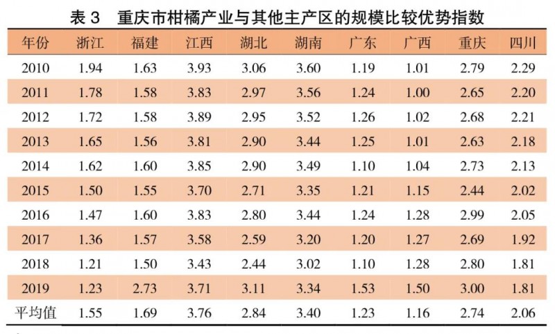 柑橘的规模比较优势指数反映一个地区柑橘生产的规模水平和集中优势(表3),重庆市柑橘生产规模比较优势指数在全国九大主要柑橘产区中位居前列,平均值为2.74,具有一定的规模比较优势。具体来说,重庆市柑橘产业在2015年及以前始终保持在第4位,其后,除2017年外均排名第3。2016、2017年重庆市柑橘规模比较优势指数分别为2.99、2.69,大于湖北省在这2年的规模,仅次于江西省和湖南省。从历年的柑橘规模比较优势指数变化趋势来看,重庆市柑橘规模呈不断上升趋势,规模比较优势指数从2010年的2.79上升为2019年的3.00。可见,重庆市委市政府以及果农对柑橘产业的重视程度在不断提高,促使柑橘的种植面积不断扩大、产量不断提高。根据上述效率比较优势指数下降趋势和发展现状可知,重庆市柑橘产业受小农经济模式的影响,呈现出种植方式零星分散、新型农业机械使用程度不高、经营管理方式传统等特征,柑橘比较优势的提高受到一定的限制。