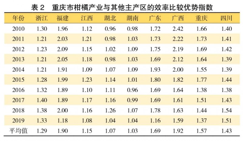 对比我国主要生产柑橘的9个省(区、市)的效率比较优势指数(表2)可看出,2010—2019年重庆市柑橘比较优势一直位居前5,平均值为1.57,高于全国平均水平,但与广西、广东和福建3个省份相比,仍然存在一定的差距。2011年,重庆市柑橘效率比较优势指数与广东省一致,为1.73,大于1,仅次于广西壮族自治区的2.22和福建省的2.03,位于主要产区第3位,反映出重庆市柑橘生产效率高于全国平均水平,且在全国主要生产地区中占有比较强的优势,具备较强的竞争力。2016年,重庆市柑橘效率比较优势指数由2015年的1.77降到1.38,下降了22.03%,幅度较大,但是除了浙江省的柑橘效率比较优势指数由2015年的1.28上升为1.32,小幅度上升了3.13%,其余地区都有下降的趋势,2016年全国可能是由于市场需求、资源禀赋、种植环境等因素相互作用,导致大部分地区柑橘单产水平有所下降。