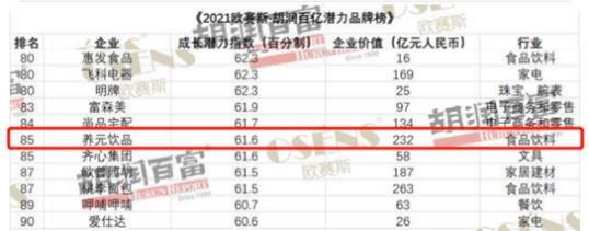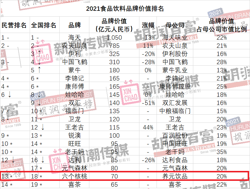 10月26日,胡润研究院发布《2021胡润品牌榜》(Hurun Most Valuable China Brands 2021),200强最具价值中国品牌上榜。六个核桃首次上榜最具价值中国品牌榜,并在食品饮料行业类目中位列全国民营企业第十三。而作为六个核桃母公司的养元饮品在两周前也凭借超高的“成长潜力指数”(即营收、市值增长能力)登上《2021胡润百亿潜力品牌榜》,成为百家最具成长潜力的中国本土企业之一。