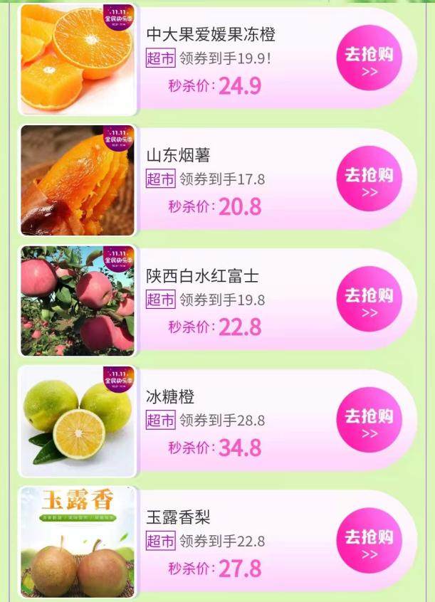 很多人付尾款前已经囤好泡面,接下来一个月准备好与泡面作伴了。但其实“真快乐”APP双11活动大促,水果生鲜也能超低价。比如,中大果爱媛果冻橙鲜甜多汁,皮薄肉厚,5斤装秒杀价仅需24.9元;杞农优食山西红富士苹果9斤也仅需22.8元,轻松实现一天一个苹果;更有远达玉露香梨,净重5斤27.8元就能买回家,让我们轻松实现水果自由,给平淡的日子里多一抹彩色。