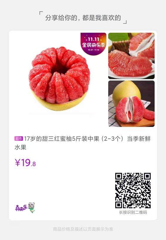 橙子是当季水果,柚子也未过时令。比如产自广西的17岁的甜三红蜜柚,通过新鲜采摘,红肉诱人,果粒饱满多汁,营养丰富,碳水化合物、维生素、胡萝卜素、膳食纤维等应有尽有!而且吃完柚子,剩下的柚子皮还可做成茶叶,暖胃润喉。如此宝藏水果在“真快乐”双11大促时,不到20元便可入手5斤,超实惠。
