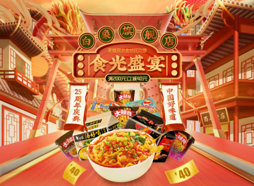 以国货速食品牌白象食品为例,恰逢公司25周年,在天猫旗舰店以“食光盛宴”为主题全场满200减40。大辣娇火鸡拌面、重庆小面、小龙虾拌面、骨汤酸辣粉、南昌拌粉等几款网红辣味美食更是在促销价的基础上再打折给出了活动价。相较于原价,有的产品甚至便宜了近一半的价格。优惠力度如此之大,许多爱吃的人纷纷开启了囤货模式。