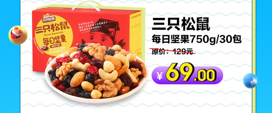 双11正是囤美食的大好时机,说起舌尖上的美味,“真快乐”APP上的众多爆款休闲零食绝对不容错过。例如,家喻户晓的三只松鼠每日坚果,原价129元,活动直降60,直播价仅69元,大人小孩都爱吃,美味又营养,为健康打call。