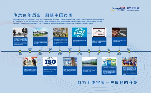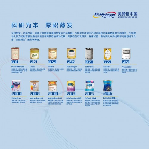 美赞臣于1905年创立,始终坚持以科学为本进行产品研发和创新,为全球婴幼儿提供科学营养,致力于“给宝宝一生最好的开始”。创立116年来,美赞臣所生产的70多种营养产品行销50多个国家和地区,其中包括20多种针对特殊营养需求和代谢问题的特殊配方产品。