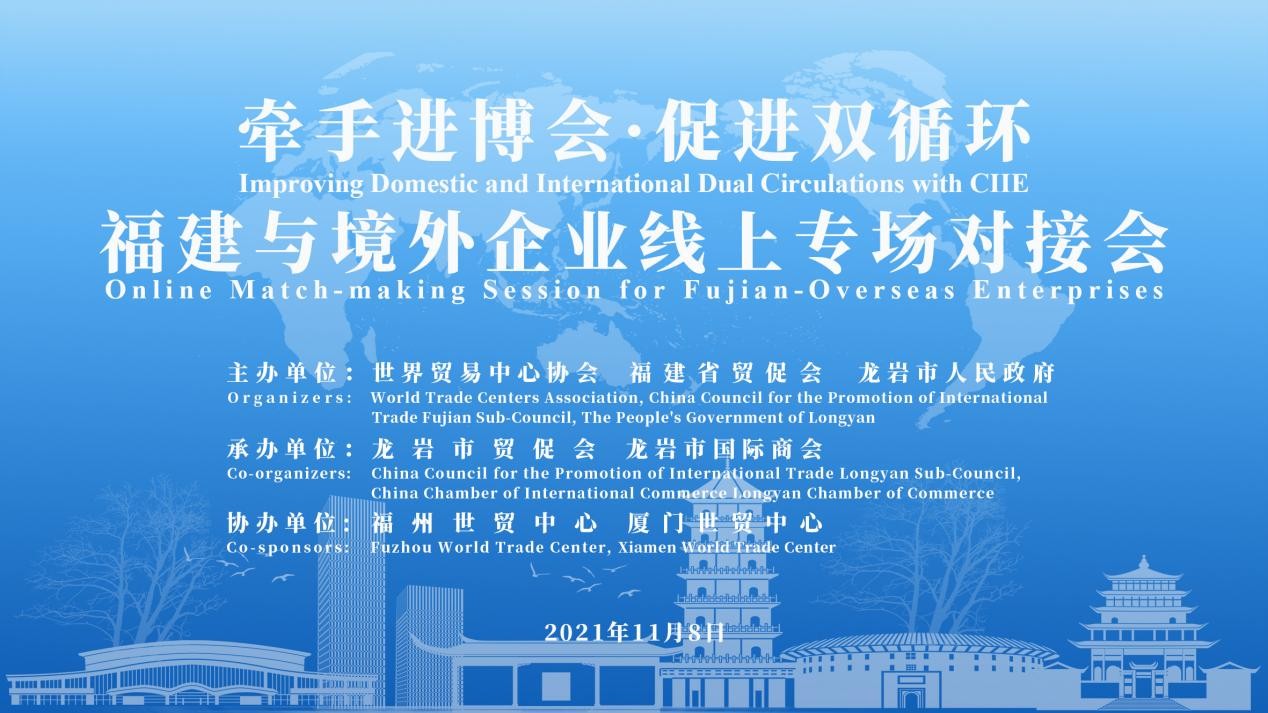 11月8日,由福建省贸促会、龙岩市人民政府与世界贸易中心协会联合主办的“牵手进博会·促进双循环——福建与境外企业线上专场对接会”通过ZOOM国际视频会议平台成功举办。本次活动旨在更好地发挥贸促会衔接内外、对接供需的优势,为企业提供更加优质高效的服务,以进博会为纽带,帮助福建与境外企业对接供需,增进交流。