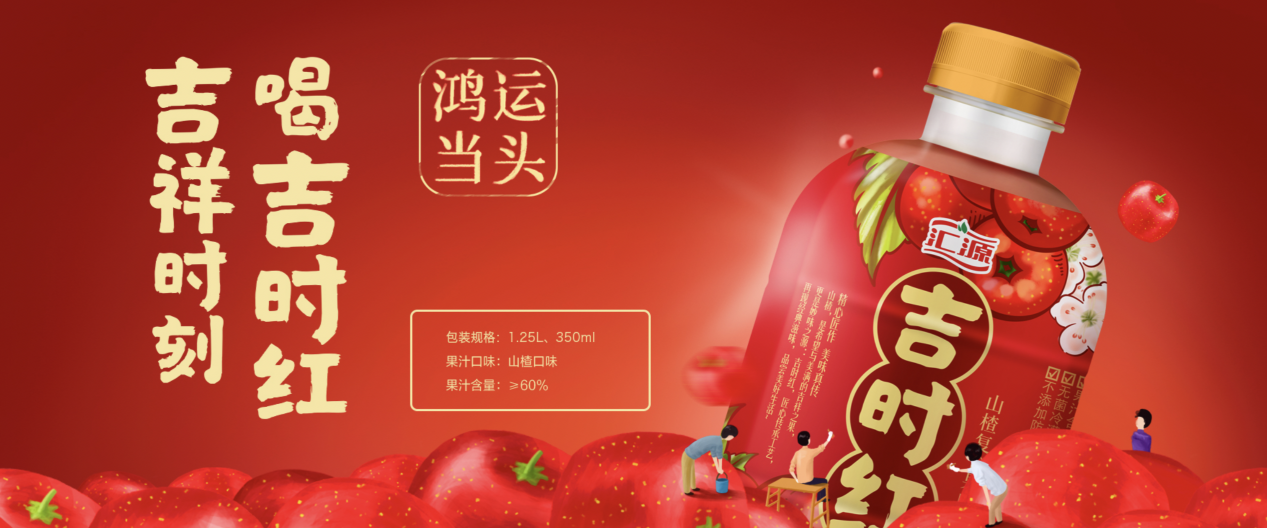 吉时红是汇源针对聚会、餐饮等日常消费场景推出的一款山楂复合果肉饮料,甄选优质山楂原料,采用无菌冷灌装等先进工艺加工而成,果汁含量达到60%以上,保留美味口感的同时,也更好地保存山楂中富含的多种维生素以及膳食纤维,营养丰富,果香浓厚。吉时红在包装上颇为用心,充分结合中国传统文化中对红色的偏爱,采用了红色为主色调,与山楂的原色相吻合,同时也能满足中国消费者对喜庆氛围的偏好。