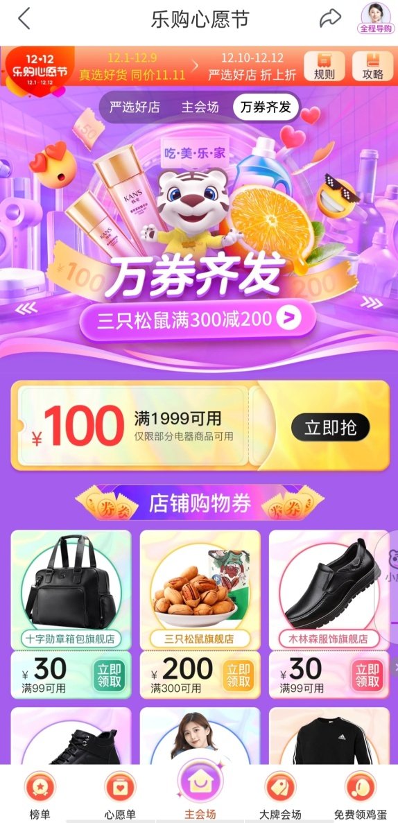 进入“真快乐”乐购心愿节主会场,各种神券来袭,超大额店铺购物券和单品补贴券,有没有戳中你的心?来看看有哪些必领优惠券:店铺购物券专区,超多品牌都开启了让利模式,如三只松鼠旗舰店“满300减200”、小牛凯西旗舰店“满199减100”……还有vivo、海尔、联想、雪中飞、立白等大牌特惠来袭,真低价,优惠多多。