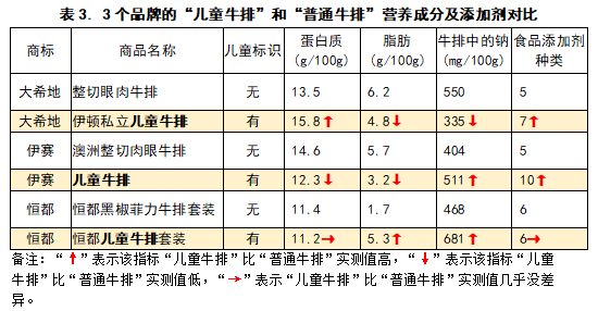 “儿童牛排”与“普通牛排”有何差异呢?本次比较试验选取了三组同品牌的“儿童牛排”和“普通牛排”进行营养成分和食品添加剂对比。