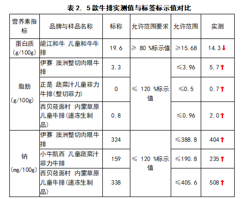 (六)营养标签与实际不符:龍江和牛、伊赛、正是、西贝莜面村、小牛凯西5个品牌样品共7个指标(蛋白质、脂肪、钠)实际检测值与其标签标示值不符。