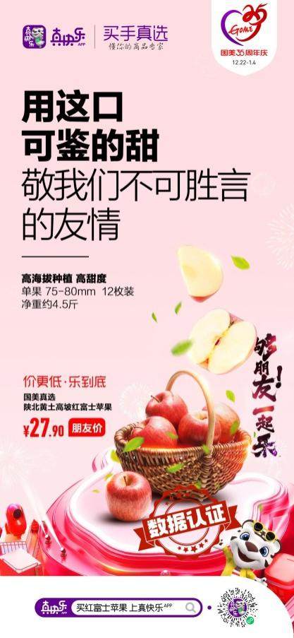 和朋友在一起的日子,甜蜜无处不在。国美真选陕北黄土高坡红富士苹果,用这口可鉴的甜,敬我们不可胜言的友情!好苹果用数据说话,“真快乐”真选买手走遍7大苹果主要产区,只为一口好苹果,从规格、脆度、汁水、果肉、外观多维度测评了50多款苹果,最终选择陕北的红富士。现在上“真快乐”APP,这款陕北红富士75-80mm一级果12枚装,净重约4.5斤,朋友价27.9元。