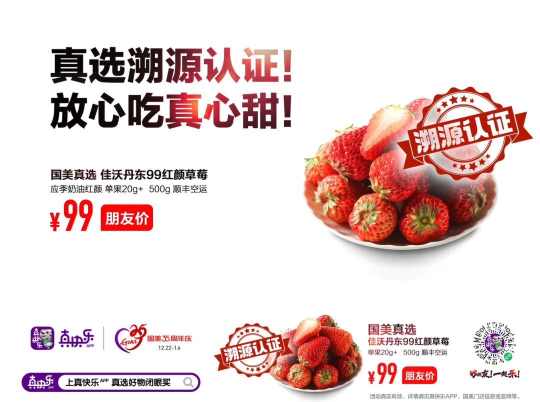 用心做好果,微微一笑为红颜!国美真选佳沃丹东99红颜草莓,是真选买手经过对其PH值、温度湿度、糖度值进行检测,通过真选溯源认证才寻味到的好果,放心吃真心甜。现在上“真快乐”APP,这款红颜草莓500g、单果20g+、顺丰空运,朋友价仅99元。