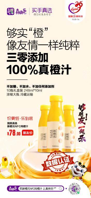 好朋友,够实“橙”才好!新橙元【国美好货】NFC纯橙汁,不加糖、不加水、不加任何添加剂,100%真橙汁,像我们的友情一样纯粹,6瓶礼盒装248ml,朋友价78元。新橙元NFC纯橙汁,从清洗分拣、冷压榨汁、巴氏瞬时杀菌,到低温罐装,全产业链把控,24H鲜橙到汁,0-4ºC冷藏保鲜28天,经真选数据认证,经得起检验的好橙汁。