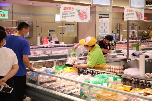 同时各配送中心均配备食品安全检测室,并拥有专业质量检测团队和检验设备设施,依规检测果蔬商品、鲜冻肉类、水产类、蛋类等商品,同步将检测结果公示在其所配送的门店,真正做到让消费者“看得到,放心买”;每天,该环节工作人员还根据门店订货商品数量到动物卫生监督管理所进行换证,同时扫描发送至门店,提升门店生鲜商品的安全可控性。