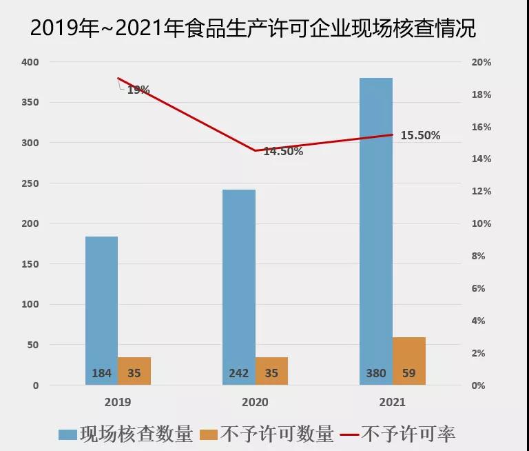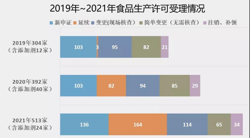 2021年,南京市食品质量安全监控中心(以下简称“监控中心”)共计受理了489家企业的普通食品生产许可申请,其中新发证申请134家,延续申请158家,变更(需现场核查)申请98家,简单变更(无需现场核查)65家,注销、补领申请34家;受理食品添加剂企业24家,全年受理企业总计513家;组织现场核查企业380家;不予行政许可59家,不予许可率15.5%。2021年全年受理企业总数较2020年上升30.8%,现场核查企业数比2020年全年上升57%。