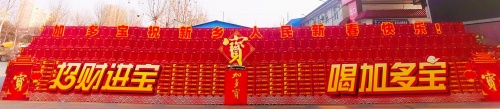 “火红的礼盒传递浓浓的年味,金灿灿的宝字写出新春的祝福。”