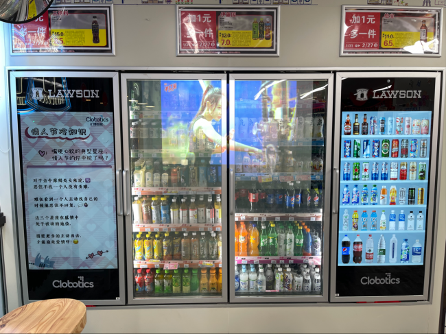 近期恰逢情人节,该便利店还通过店内的冰柜大屏做起了节庆活动,在大屏上滚动播放各种情人节冷知识。据该店长透露,自从大屏冰柜投入使用后,有不少顾客都会驻足观看,甚至有顾客会拍照并Po在自己的社交账号中,可谓店内新春的“明星”。除了观看与拍照分享,该设备也给冷饮区的人气带来了提升,虽然没有直接的销量统计,但是相较往年初春,还是能感到冷饮销量有些提升,尤其是冰柜上播放广告的产品。店长还讲了一个关于该冰柜的小故事:“还有个顾客询问是否能在大屏上播放自己的内容,说自己在附近工作,路过的时候看到我们冰柜屏幕上显示的情人节主题内容,觉得很有意思,问是否能包下屏幕用来给另一半来表白。”
