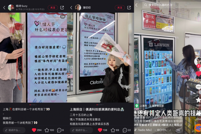 除了顾客的喜爱,新奇的冰柜也吸引了不少来自抖音、小红书等平台的网红,前来打卡并和这台特别的饮料冰柜进行“亲密接触”。其中,有小红书博主写到“科技感拉满”,“仿佛在假装自动售货机”,还有博主气呼呼地“抱怨”“为什么要给单身狗看情人节小知识”,再加上氛围感满满的合影,获赞无数。部分抖音博主更是别出心裁,紧扣冬奥时事,采用比赛解说的方式带粉丝们实地参访,并与冰柜进行互动。充满喜感的文案与博主活泼的演绎,“笑”果十足,获得了数万次的点赞。