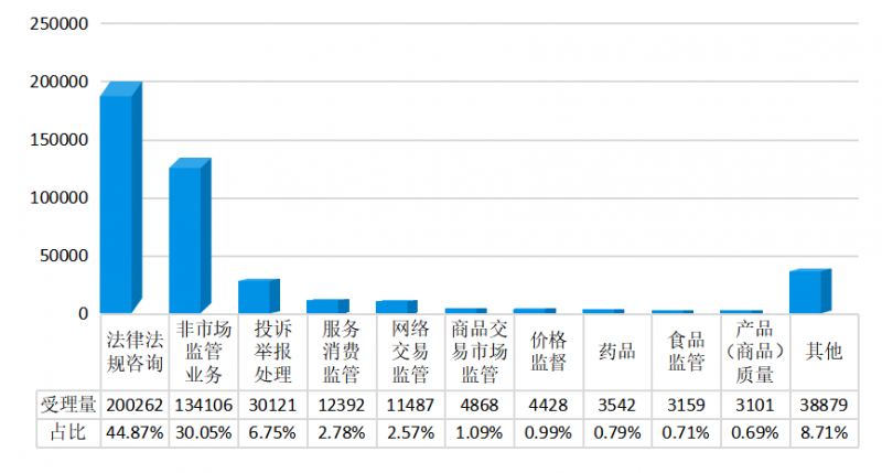 2021年,12315中心共受理咨询446345件。位居前五位的分别是:法律法规咨询、非市场监管咨询、投诉举报处理、服务消费监管、网络交易监管,合计占咨询总量的87.02%。其中,服务消费监管、网络交易监管咨询量取代价格监督、食品监管咨询量进入前5位,其余排位与上年基本一致。
