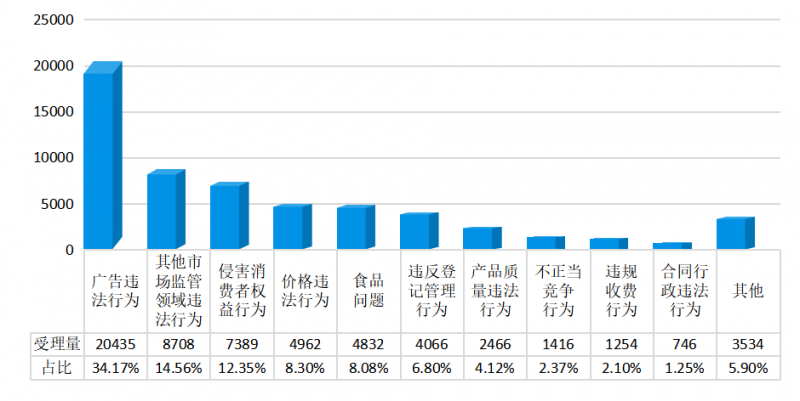 2021年,12315中心共受理举报59808件。位居前五位的分别是:广告违法行为、其他市场监管领域违法行为、侵害消费者权益行为、价格违法行为、食品问题,合计占举报总量的77.46%。其中,广告违法行为举报量仍居首位,其他市场监管领域违法行为举报量排位进入前5位,食品问题举报量排位由上年第4位降至第5位。
