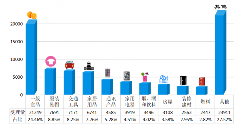 全省投诉类位居前五位的分别是:一般食品、销售服务、餐饮服务、服装鞋帽、交通工具,合计占投诉总量的34.55%。