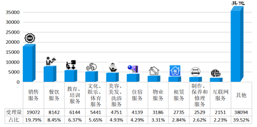 服务类投诉位居前三位的分别是:销售服务、餐饮服务、教育培训服务,合计占服务类投诉总量的34.61%。其中,教育、培训服务投诉量由上年的第7位升至第3位,其余与上年排位基本一致。