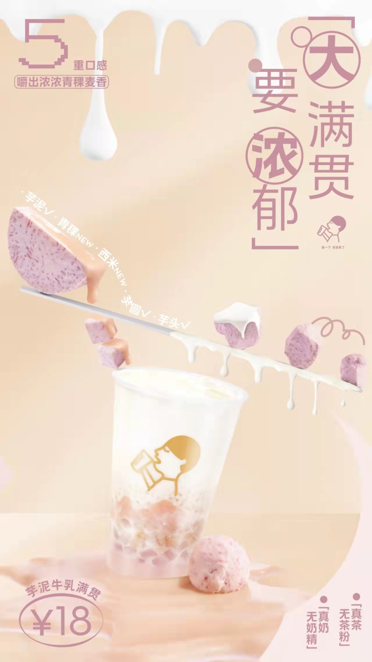 除“清爽不喝腻”外,2月22日喜茶“要浓郁”系列还上新了一款“芋泥牛乳满贯”。作为喜茶芋泥系列的延伸,芋泥牛乳满贯在经典元素定制槟榔芋泥和芋头丁之外,首次采用青稞小料。现蒸芋泥口感绵密,芋头丁颗颗分明,青稞则带来嚼劲和麦香,还有芋圆波波、西米等小料,形成混合在牛乳之中的多重口感,带来浓郁的原料“大满贯”享受。