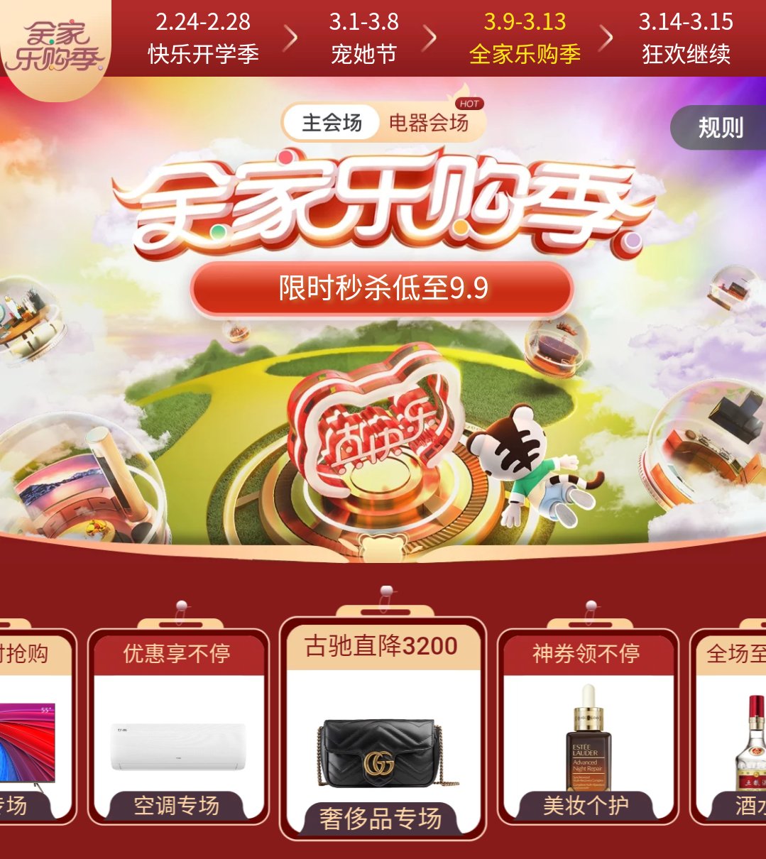 3月9日起,真快乐APP全家乐购季燃爆开启,大牌商家齐聚发福利,真选、严选好物打造品质消费,真值真快乐,吃货朋友速速看过来,全家乐购季食品、粮油超多好物全网比质比价,美味势不可挡!