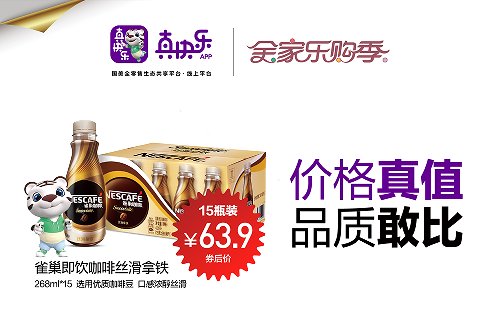 如今,咖啡类饮品已成为上班族、学生党非常喜欢的一种饮品了,工作学习忙碌时,一杯香醇的咖啡能够更好地振奋精神,专注解决工作。但是,由于咖啡不比一般饮品,在价格上还是偏贵。现在好了,真快乐APP全家乐购季雀巢即饮咖啡丝滑拿铁,优选咖啡豆,口感浓醇丝滑,15瓶装只要63.9,价格真值,助你快速实现咖啡自由!