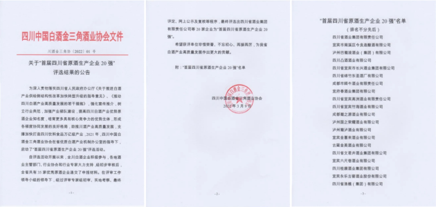为深入贯彻落实四川省人民政府办公厅《关于推进白酒产业供给侧结构性改革加快转型升级的指导意见》《推动四川白酒产业高质量发展的若干措施》,四川中国白酒金三角酒业协会在省优质白酒产业机制办公室的指导下,启动了“首届四川省原酒生产企业20强”评选活动。在2022年3月14日公布的评选结果中,川酒集团以总分95.3分(满分100分)的成绩名列第一,是获奖企业中唯一的大型综合性国企。