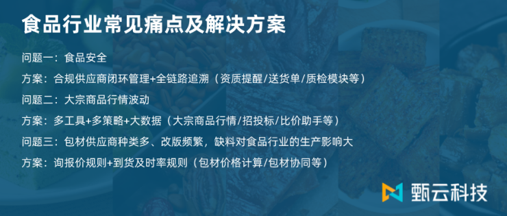 供应商管理不够精细化、过程管理难以实现闭环、追溯难度大、原料价格波动大、寻源效率低、组织间协同性差等是食品行业当前最明显的采购痛点,甄云科技在服务食品行业客户时,总结出了一套满足业务需求及可快捷复制的解决方案。