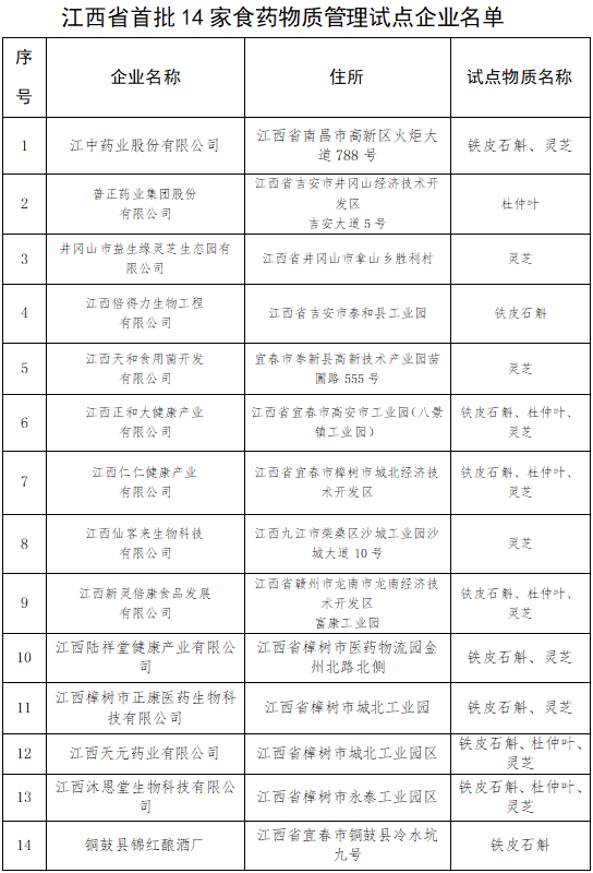 2022年1季度,江西共有江中药业股份有限公司、普正药业集团股份有限公司等14家大中型生产企业通过了铁皮石斛、杜仲叶、灵芝按照传统既是食品又是中药材物质管理试点审查,获批开展食药物质试点生产销售。