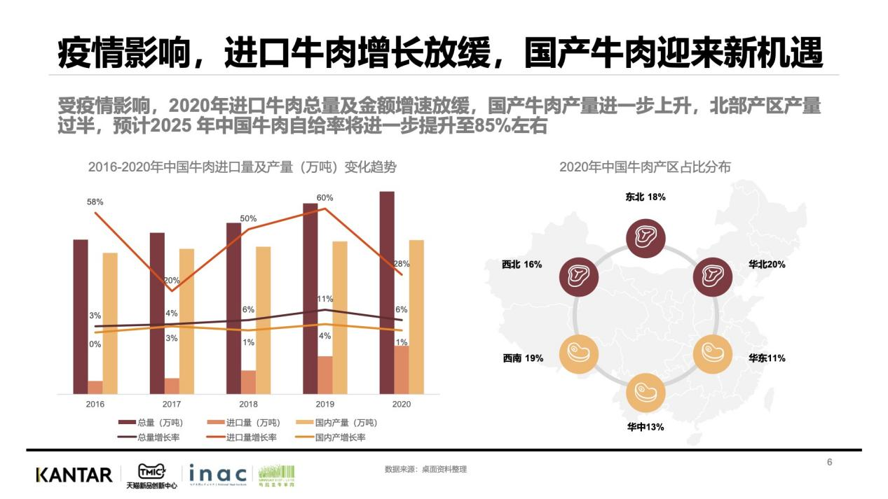 疫情影响进口牛肉增长放缓,国产牛肉成为一匹「黑马」,未来增长潜力巨大。据《2022 牛排消费趋势报告》,预计 2025 年中国牛肉自给率将进一步提升至 85% 左右。