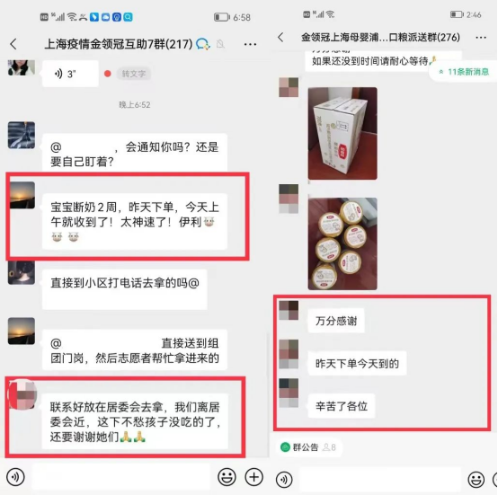 “万分感谢,昨天下单今天到,辛苦了各位。”宝爸宝妈焦急的下单信息、“金卫士”们的积极回应、完成订单家庭的感谢……信息交织在互助群,为守护全城宝宝撑起巨大保护网。