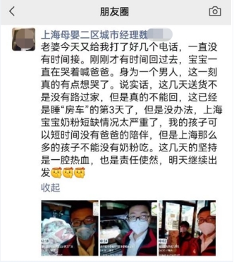 “这几天送货不是没有路过家,但是真的不能回……我的孩子可以短时间没有爸爸的陪伴,但是上海那么多的孩子不能没有奶粉吃。这几天的坚持是一腔热血,也是责任使然,明天继续出发。”小魏在自己的朋友圈里如是分享,给自己和更多的宝爸宝妈加油!